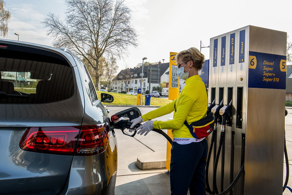 2020年4月9日,在德国施韦尔特的一处加油站,一辆车在加油。(新华社发,约阿希姆·毕瓦勒兹摄)