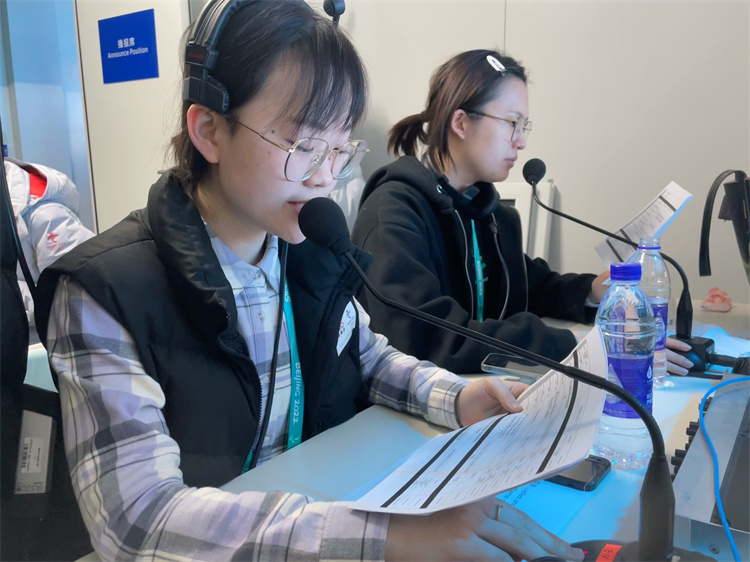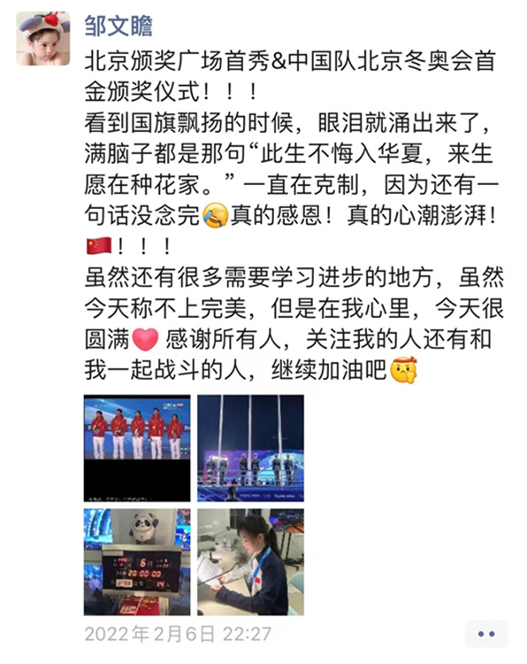 2月6日晚8时,中国队获得短道速滑混合团体接力项目金牌的播报在北京颁奖广场进行。“Médaille d’or et champions olympiques, République populaire de Chine !(中国队获得金牌和奥运冠军!)” 邹文瞻清脆的声音在北京颁奖广场上空回荡,传向世界。