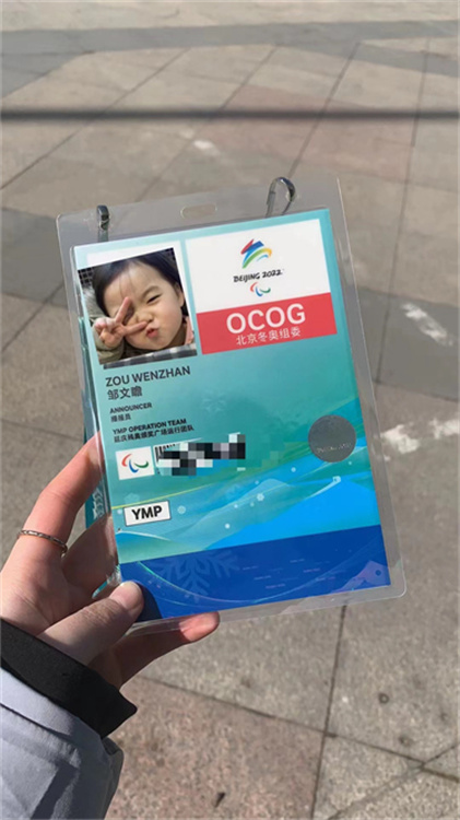 | 邹文瞻展示自己的冬残奥播报员证。图片由受访者提供 |