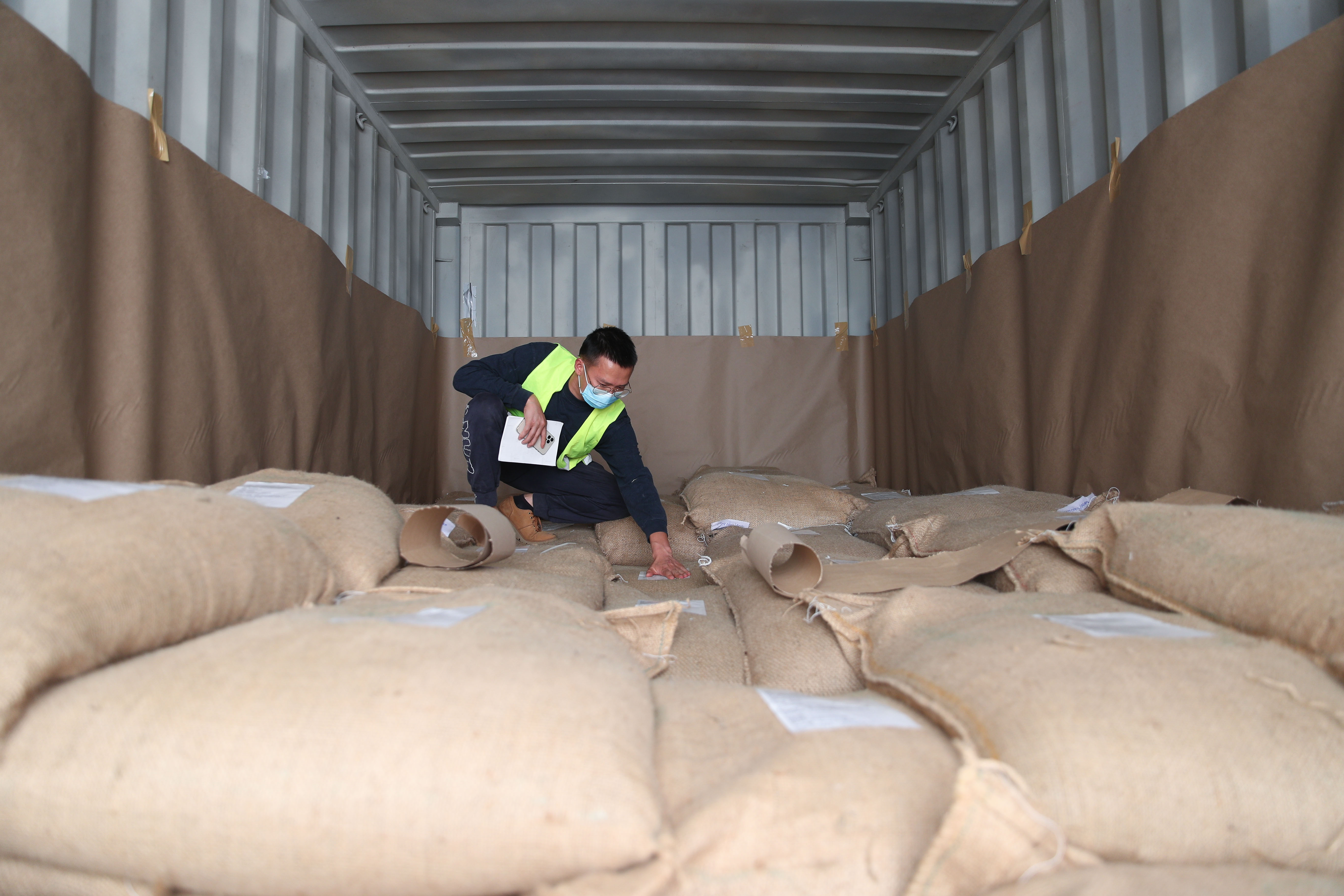 新华社照片,内罗毕,2022年3月1日 (国际·图文互动)(2)中非贸易疫情下再创新高 凸显中非经贸合作韧性 2021年5月26日,在肯尼亚内罗毕,中国青年张仁全在发货前为出口中国的咖啡贴上标签。 (配本社同题文字稿) 新华社记者 龙雷 摄