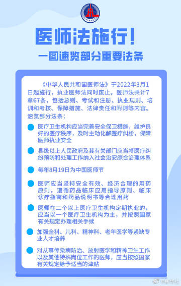 【#医师法3月1日施行#!我国医师队伍建设迈出关键步伐】《中华人民共和国医师法》于2022年3月1日起施行,执业医师法同时废止。医师法共计7章67条,包括总则、考试和注册、执业规则、培训和考核、保障措施、法律责任和附则等内容。新施行的医师法将怎样保障医师权益、规范医师执业、推动医师队伍高质量发展?一图速览部分重要法条↓(记者顾天成、徐鹏航)