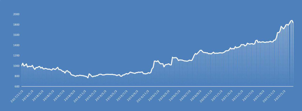 2月25日,指数报1835.21点,较上期(2022.2.14-2.20)下跌43.01点,跌幅2.29%;与基期相比上涨835.21点,涨幅83.52%。