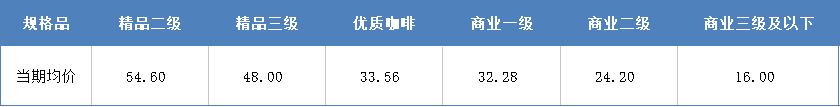 具体来看,精品二级咖啡豆均价报54.60元/公斤,较上期持平;精品三级咖啡豆均价报48.00元/公斤,较上期持平;优质咖啡豆均价报33.56元/公斤,较上期下跌0.78元/公斤,跌幅2.27%;商业一级咖啡豆均价报32.28元/公斤,较上期下跌0.94元/公斤,跌幅2.83%;商业二级咖啡豆均价报24.20元/公斤,较上期下跌0.70元/公斤,跌幅2.81%;商业三级及以下咖啡豆均价报16.00元/公斤,较上期持平。