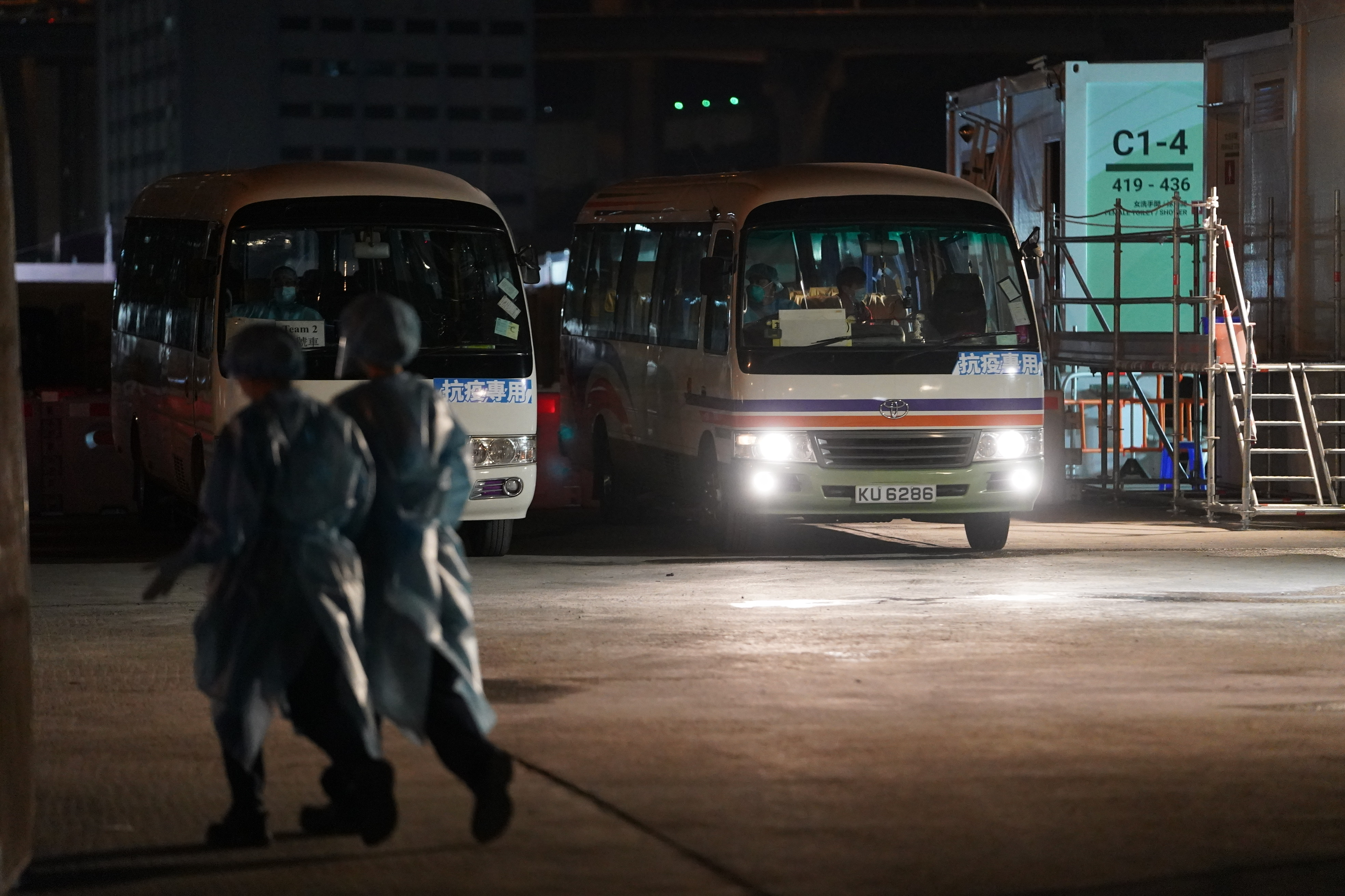 新华社照片,香港,2022年3月1日 中央援港青衣方舱医院接收首批病患 3月1日,新冠肺炎确诊患者抵达青衣方舱医院。 当日晚7时,中央援建香港的青衣方舱医院正式交由香港特区政府营运,并接收首批无症状或轻症新冠肺炎确诊患者。 新华社记者 吕小炜 摄