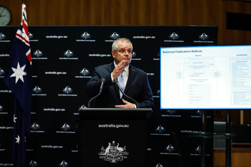 2020年5月29日,在澳大利亚堪培拉的国会大厦,澳大利亚总理莫里森出席新闻发布会。(新华社发,储晨摄)