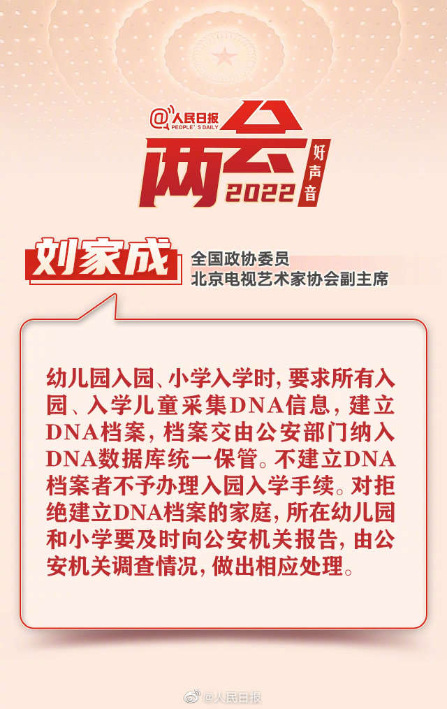全国政协委员、北京电视艺术家协会副主席刘家成建议:幼儿园入园、小学入学时,要求所有入园、入学儿童采集DNA信息,建立DNA档案,档案交由公安部门纳入DNA数据库统一保管。不建立DNA档案者不予办理入园入学手续。对拒绝建立DNA档案的家庭,所在幼儿园和小学要及时向公安机关报告,由公安机关调查情况,做出相应处理。