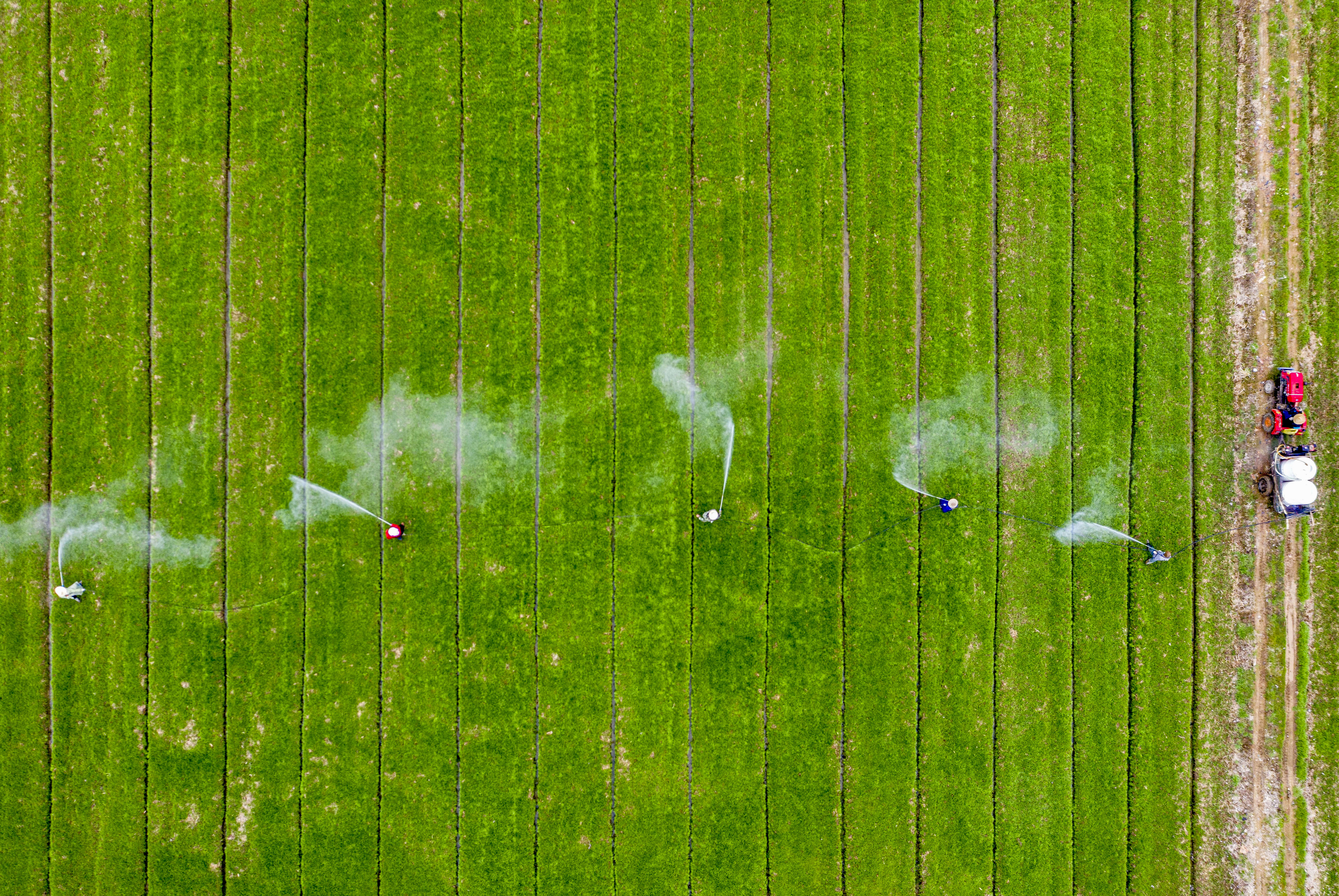 2022年2月16日,安徽省庐江县白湖镇农民在进行小麦病虫害防治作业(无人机照片)。新华社发(左学长 摄)