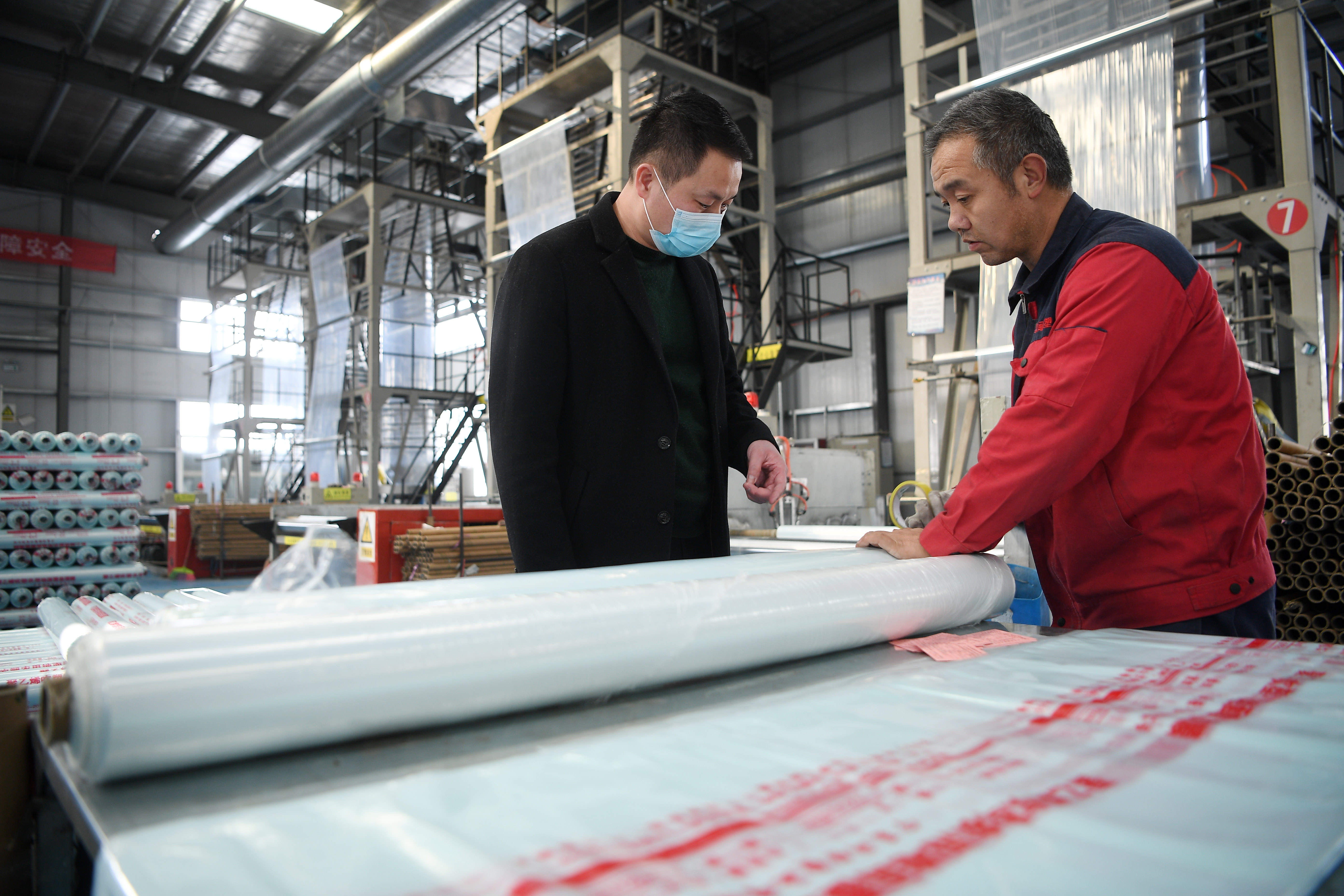 新华社照片,中卫(宁夏),2022年3月2日 山海情未了——闽宁协作助力乡村振兴新征程 来自福建的商人郑开煌(左)在位于宁夏隆德县闽宁扶贫产业园的农用薄膜生产线查看产品质量(1月28日摄)。 六盘山高,闽江水长。翻越了脱贫路上最后一座大山,闽宁两省区持续了26年的“山海情”并未因贫困的终结而结束。“脱贫摘帽不是终点,山海情缘没有断点”,如今在乡村振兴新征程上,福建和宁夏不断拓展协作深度,创新协作方式,优化协作机制,山海携手,努力奔跑在通向共同富裕的大道上。 新华社记者 王鹏 摄