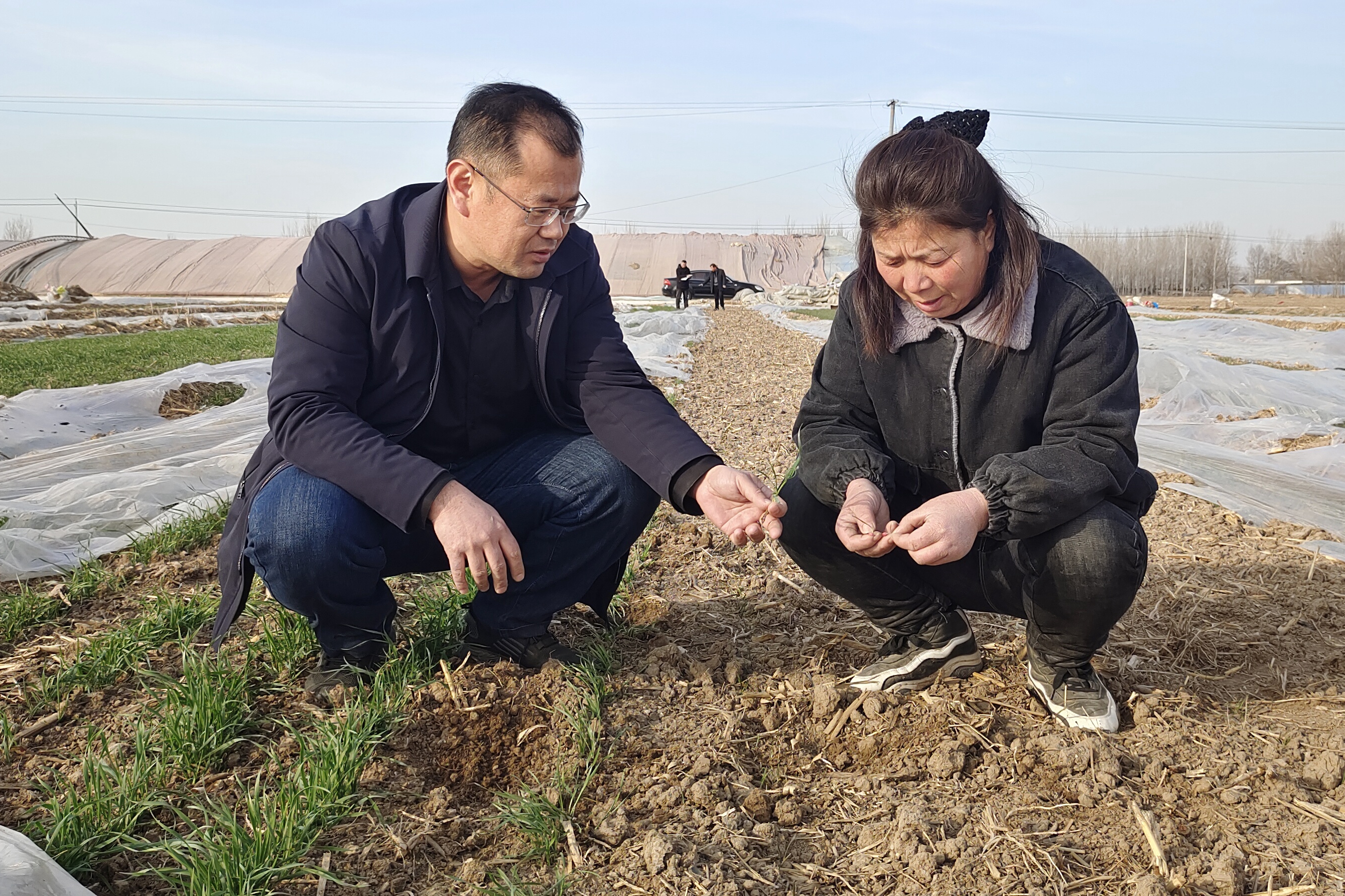 山东省阳谷县阿城镇常楼村村支书常绍兵和村民正在查看覆膜小麦的苗情。(受访单位供图)