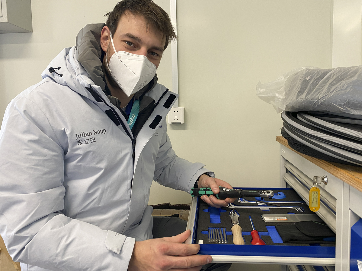 2月25日,在云顶滑雪公园,矫形器、假肢与轮椅维修中心的维修技术人员朱利安·纳普展示工作中需要使用的各类工具。(图片来源:新华社)