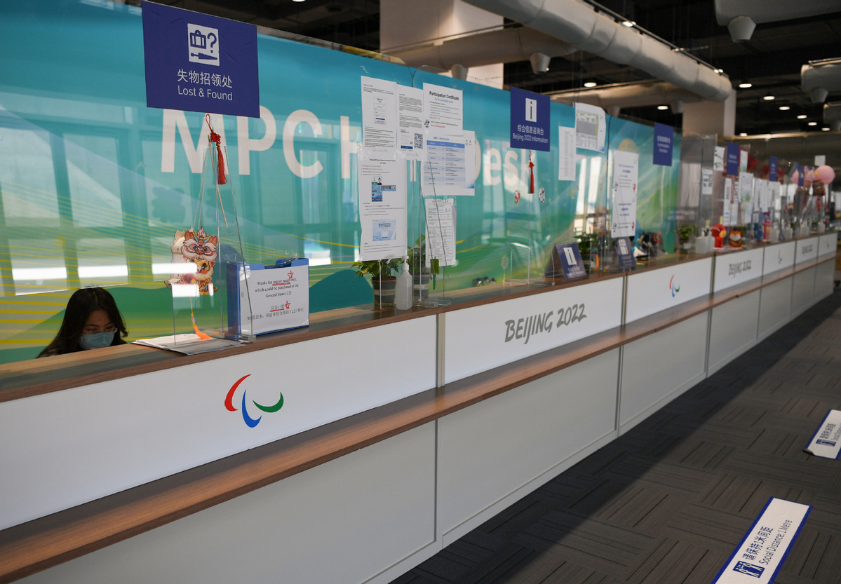 北京赛区主媒体中心内已完成标识转换的媒体工作间服务台。(图片来源:新华社)