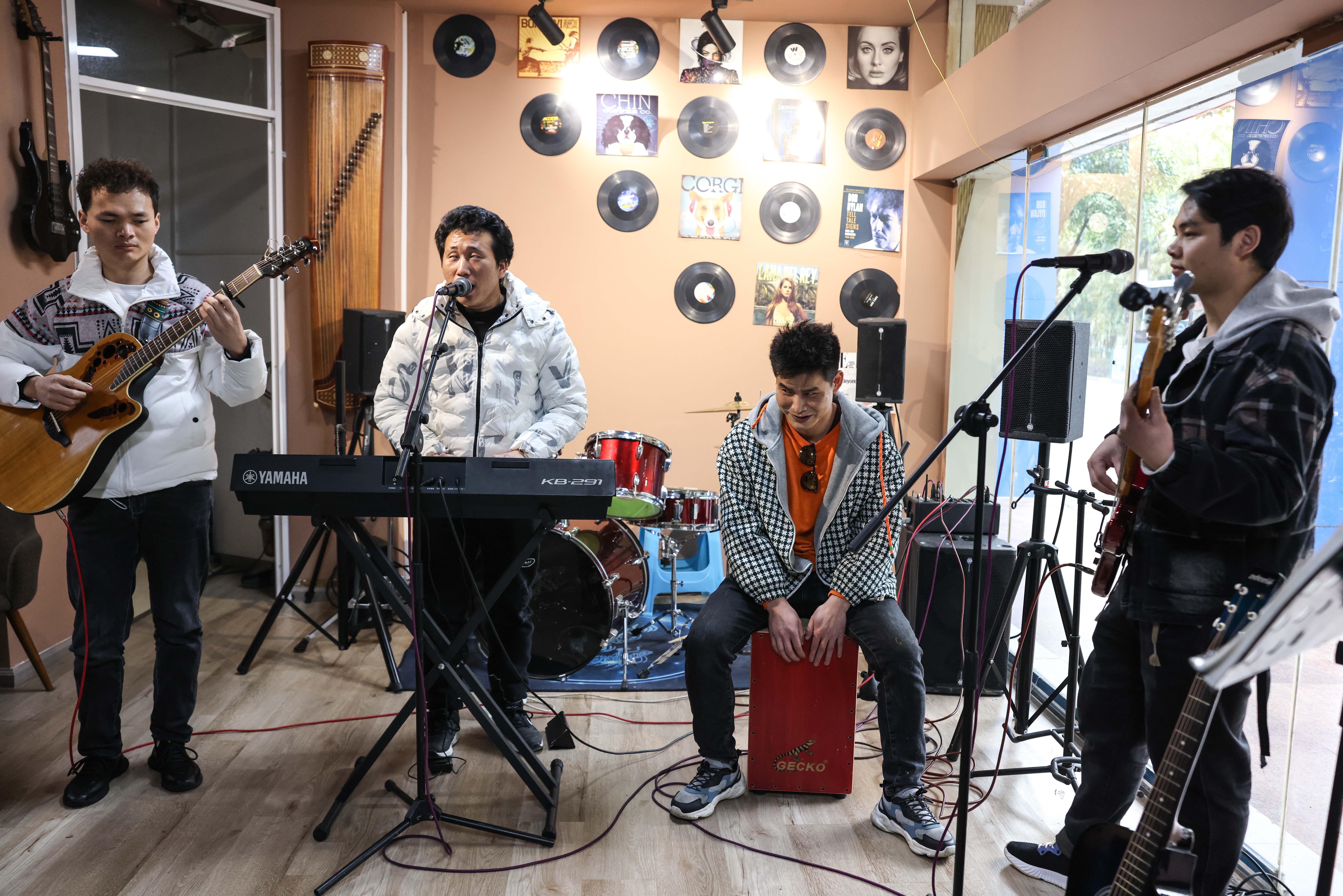 新华社照片,贵阳,2022年3月2日 “追光者”的冬残奥会之歌 3月1日,“折耳根”乐队在琴行内排练。从左到右依次是吉他手杨志、主唱陈克兴、鼓手陈昌海、贝斯手彭万海。 3位盲人推拿师、1位外卖小哥,这几名“90后”青年共同组成了“折耳根”乐队。他们白天在各自的岗位上忙碌,晚上聚在一起,用不同乐器的音符相互碰撞。除了外卖小哥彭万海视力正常,乐队的其他成员均为盲人。行走在黑暗中,他们选择追光,坚持传递正能量。他们觉得自己就像贵州人最爱吃的折耳根(鱼腥草),深埋在黑暗之中,积蓄精华,慢慢拔节生长。北京冬残奥会开幕在即,“折耳根”乐队还创作了一首属于他们自己的“冬残奥会之歌”,为运动员加油。 新华社记者 欧东衢 摄