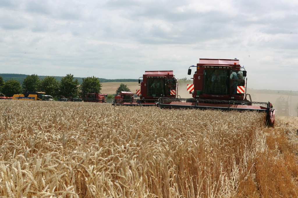 2008年7月17日,在乌克兰西南部的文尼察州,大型联合收割机在收割小麦。(新华社记者宋宗利摄)
