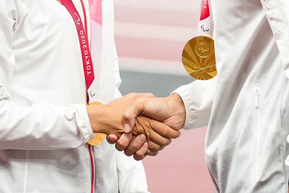 ⬆️2021年8月27日,在东京残奥会游泳女子50米蝶泳S5级颁奖仪式上,中国选手卢冬(中)单腿下蹲,与队友成姣(右)、西班牙选手玛尔塔·因方特处于同一高度合影。新华社记者 张铖 摄