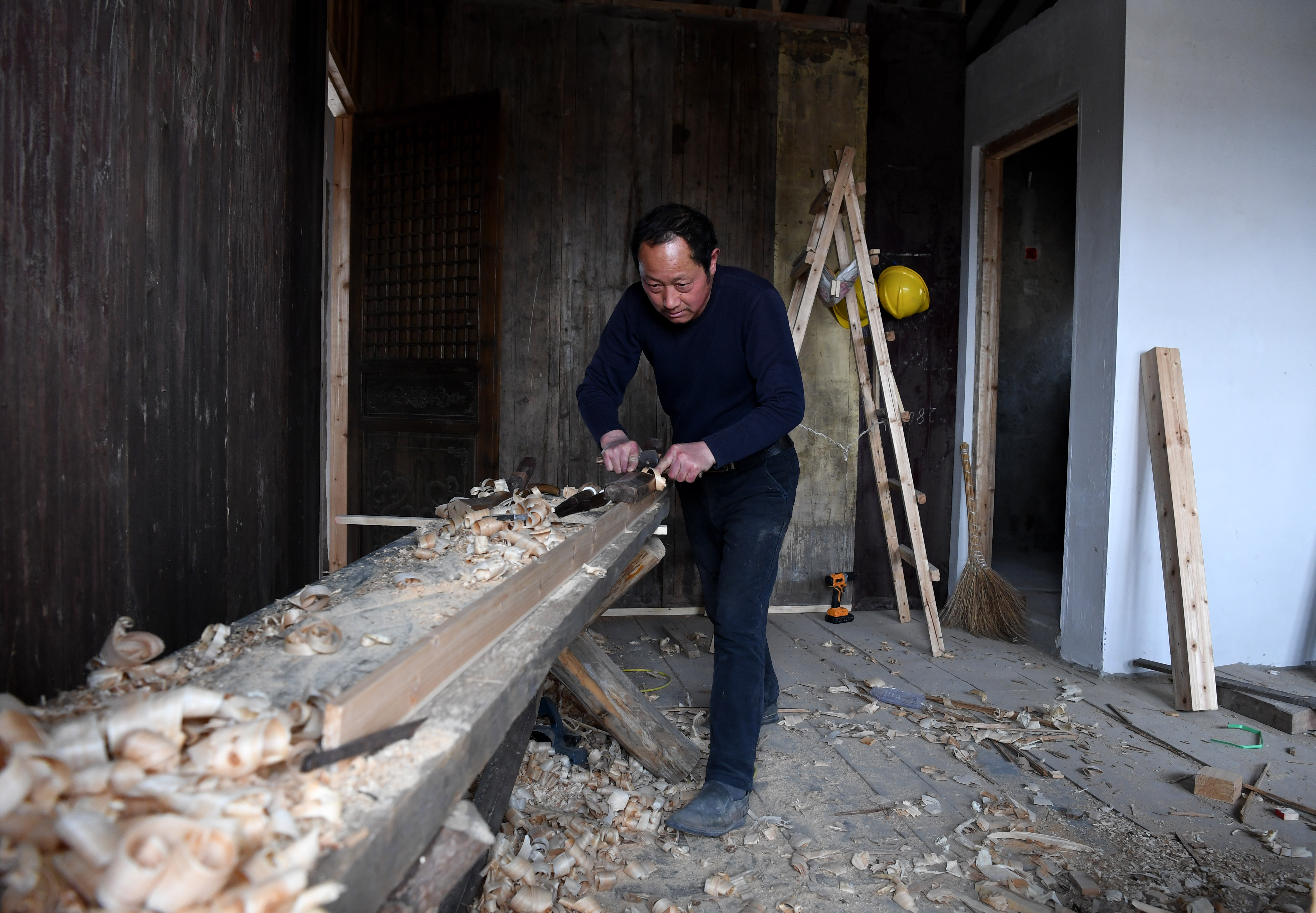 新华社照片,泾县(安徽),2022年3月2日 安徽泾县:古镇老街的蝶变 3月2日,工作人员在章渡老街上进行木料加工。 位于安徽省宣城市泾县云岭镇章渡村的章渡老街历史上曾是繁华的水陆码头,临江建有皖南独特建筑“吊栋阁”。由于年久失修,“吊栋阁”及老街上的很多建筑已经破败。2021年,当地启动章渡老街的保护修复,对“吊栋阁”周边区域实施保护及修缮,打造文化多元的全新“文旅街区”。 新华社记者 刘军喜 摄