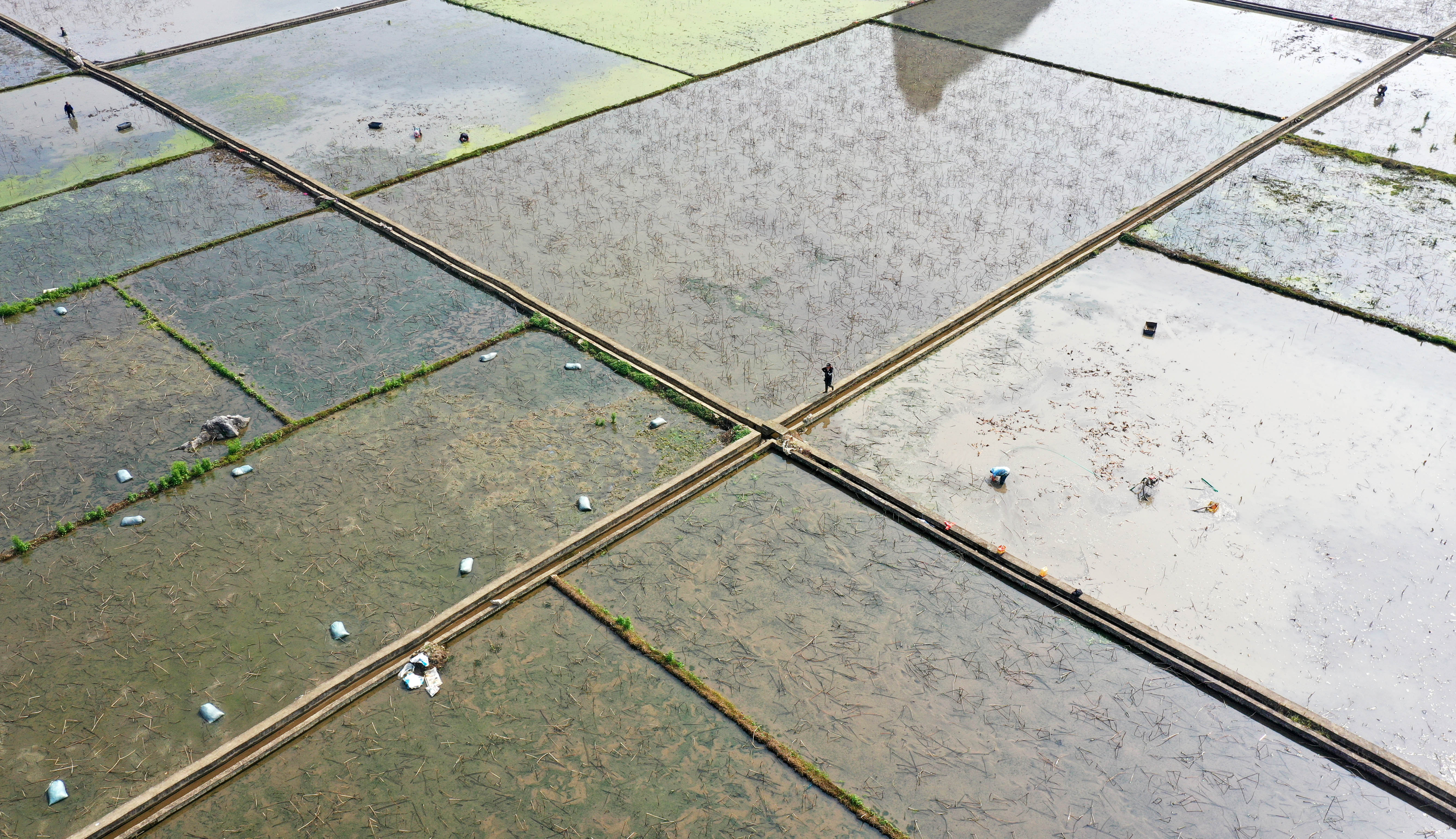 新华社照片,柳州(广西),2022年3月2日 春暖大地农事忙 3月2日,在广西柳州市柳江区进德镇龙新村,农民在荷塘里忙碌(无人机照片)。 天气转暖,各地农民抢抓农时开展春耕生产,田间地头一派农忙景象。 新华社发(黎寒池摄)