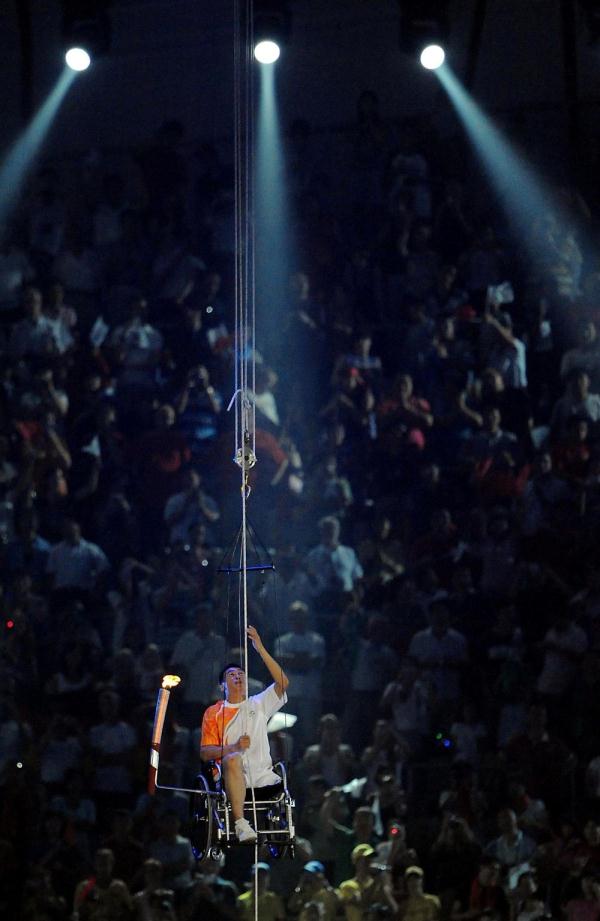 2008年9月6日,北京残奥会开幕式在国家体育场举行,三届残奥会跳高冠军侯斌将火炬安置在轮椅的支架上,靠双手攀爬将近40米长的绳索,去点燃主火炬。这段艰辛的历程挑战着人类的体能极限,展现出人类坚韧不拔的精神。新华社记者王颂摄