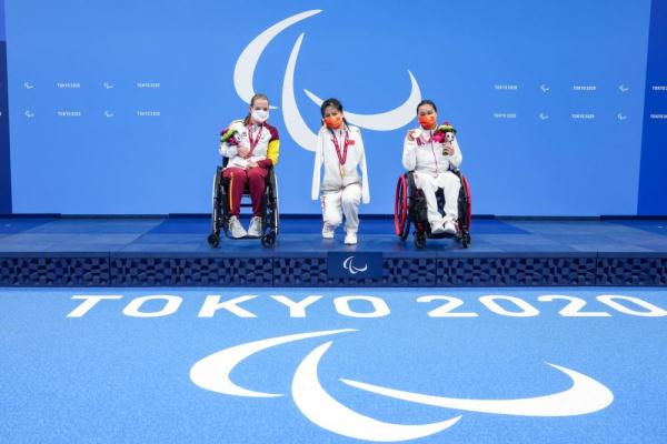 2021年8月27日,在东京残奥会游泳女子50米蝶泳S5级颁奖仪式上,中国选手卢冬(中)单腿下蹲,与队友成姣(右)、西班牙选手玛尔塔·因方特处于同一高度合影。新华社记者张铖 摄