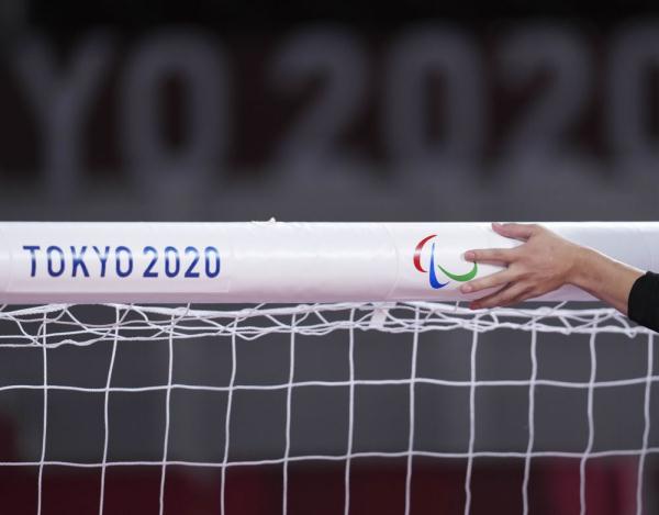 2021年8月26日,在日本千叶举行的东京残奥会男子盲人门球小组赛中,中国队球员杨明源在赛前感知球门。新华社记者 胡虎虎摄