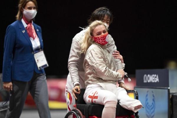 2021年8月25日,在东京残奥会轮椅击剑女子佩剑个人赛A级决赛后,冠军中国选手边静(左)在获胜后推着亚军格鲁吉亚选手妮诺离开比赛场地。新华社记者熊琦 摄