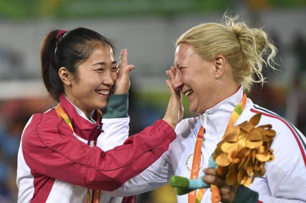 2016年9月14日,在里约残奥会轮椅击剑女子个人花剑A级颁奖仪式上,金牌得主、中国选手荣静(左)与获得铜牌的匈牙利选手克拉伊尼亚克相互擦拭泪水。新华社记者夏一方摄