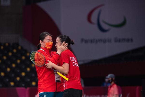 2021年9月5日,在东京残奥会羽毛球女子单打SL4级决赛中后,中国选手程和芳(右)与教练张先明庆祝夺冠。新华社记者张金加 摄