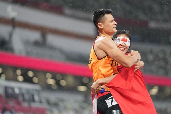 2021年9月4日,在东京残奥会田径女子200米T11级决赛中,中国选手刘翠青获得金牌。她的领跑员徐冬林将她高高举起,一同庆祝。新华社记者熊琦 摄