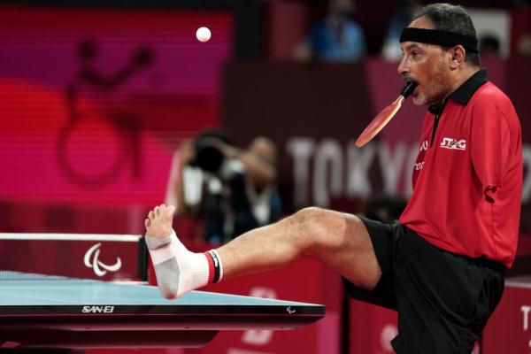2021年8月27日,埃及运动员易卜拉欣·哈马托在东京残奥会乒乓球小组赛中用脚抛发球。10岁时,哈马托由于一次火车事故使双臂致残。从那时起,他开始自学打乒乓球,并且训练出目前这套用脚抛发球、用嘴叼住球拍打球的独特方式。功夫不负有心人。他的不懈努力让他登上非洲残疾人乒乓球大赛、里约残奥会、东京残奥会的舞台。新华社记者张铖 摄