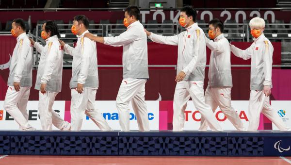 2021年9月3日,在日本千叶举行的东京残奥会男子盲人门球颁奖仪式中,中国队教练尹世强(左一)带领球员,相互扶着肩膀,参加颁奖仪式。新华社记者 张铖 摄