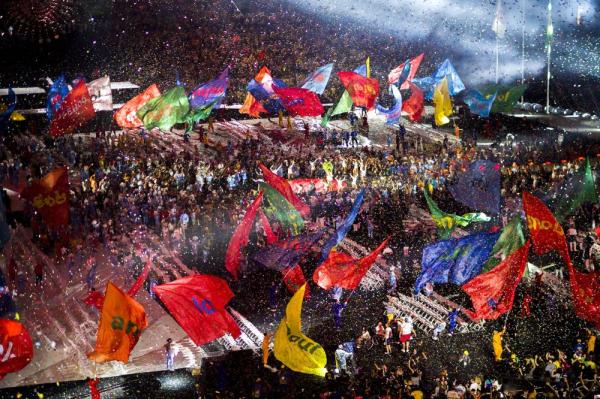 2016年9月18日,在巴西里约热内卢举行的第十五届夏季残疾人奥林匹克运动会闭幕式上,印有各国语言“爱”字样的旗帜在场内挥舞。新华社记者肖艺九摄