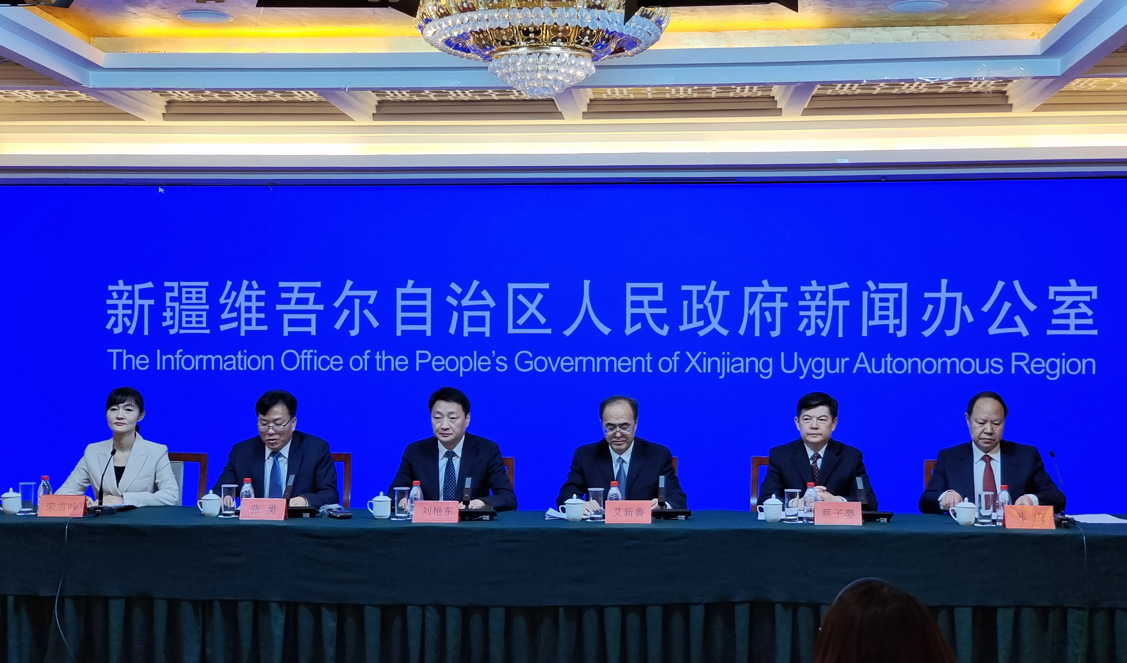新华社照片,乌鲁木齐,2022年3月2日 新疆多部门减税降费保经济平稳开局 3月2日拍摄的新疆维吾尔自治区人民政府举行的新闻发布会现场。 (配本社同题文字稿) 新华社发 (张乾摄)