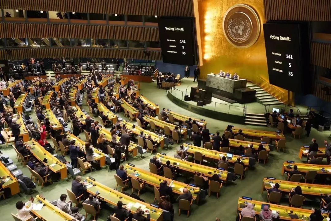 此次投票中141票赞成、5票反对、35票弃权。由于赞成票超过有效票三分之二,因此决议草案通过。俄罗斯、叙利亚、白俄罗斯、朝鲜、厄立特里亚投票反对,中国投票弃权。