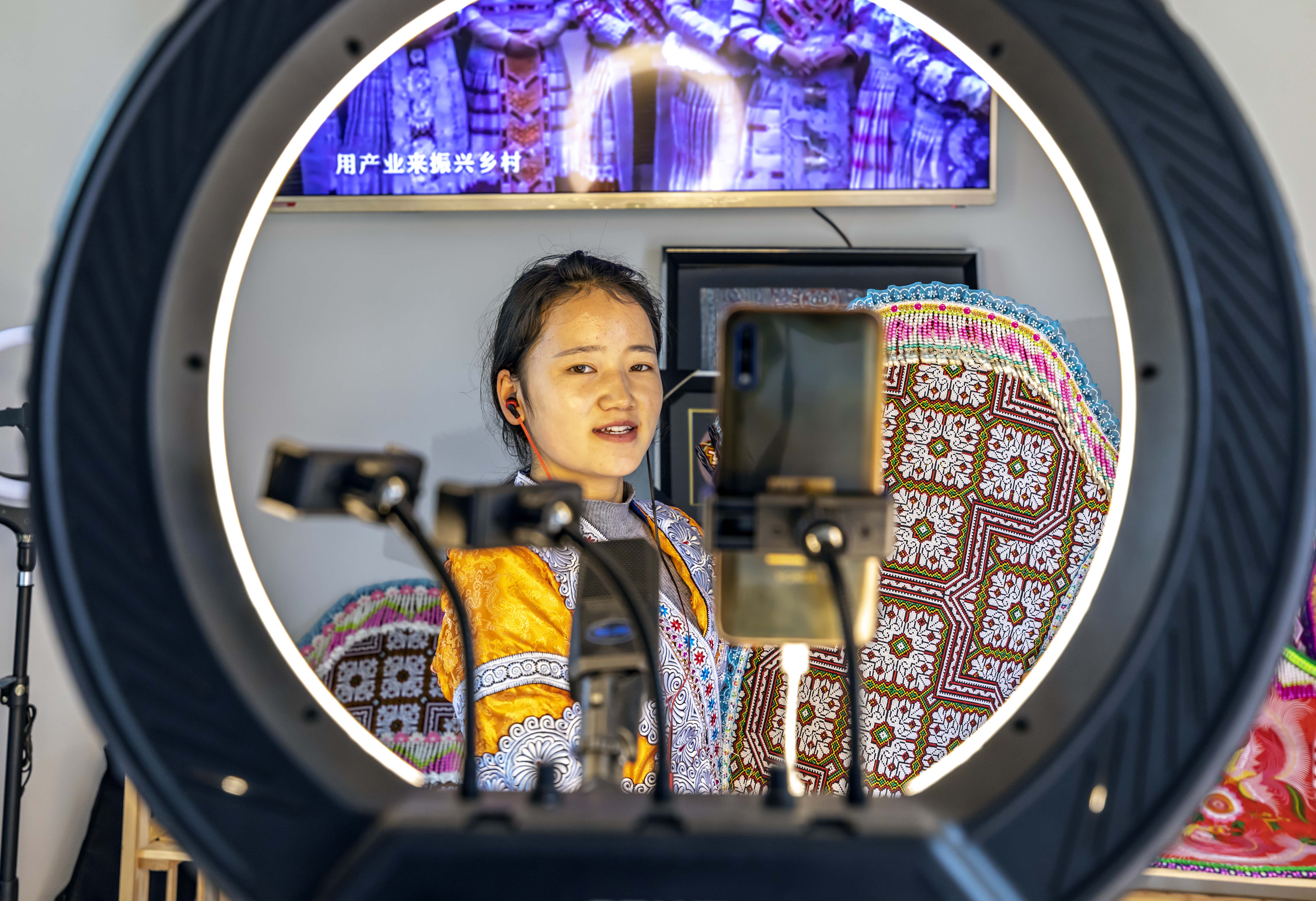 贵州省毕节市黔西县新仁苗族乡化屋村村民在直播带货(2021年4月13日摄)。新华社发(范晖摄)