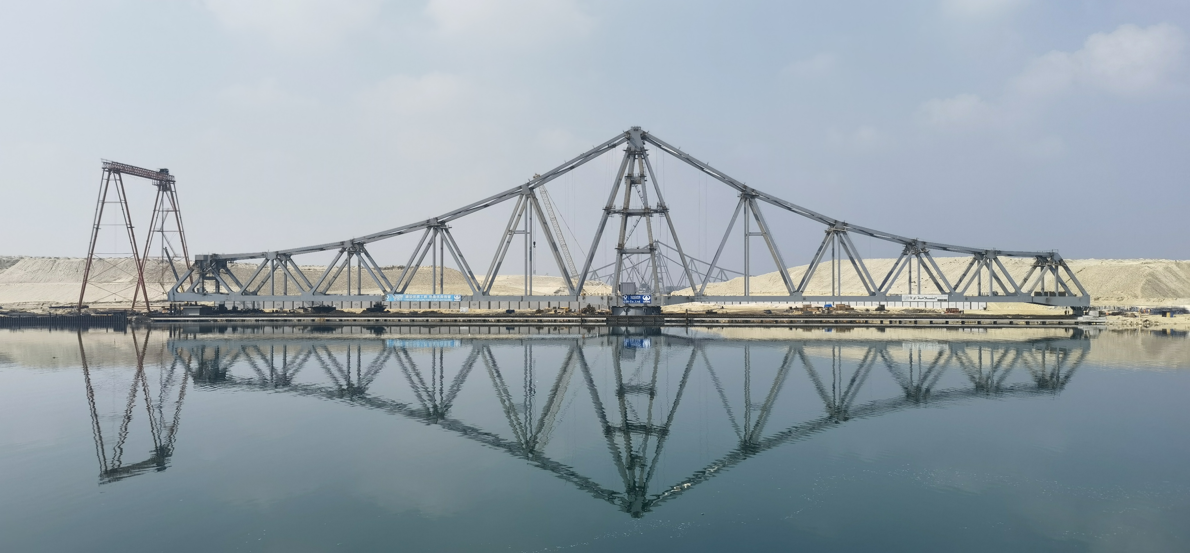 2021年11月16日,在埃及伊斯梅利亚省,由中企承建的苏伊士运河新建法尔达内铁路大桥进行转桥对接测试。新华社发(苟勇摄)