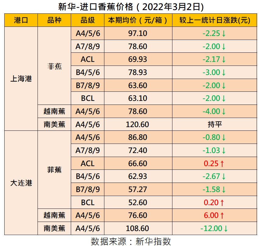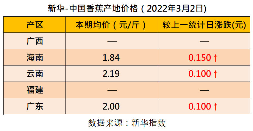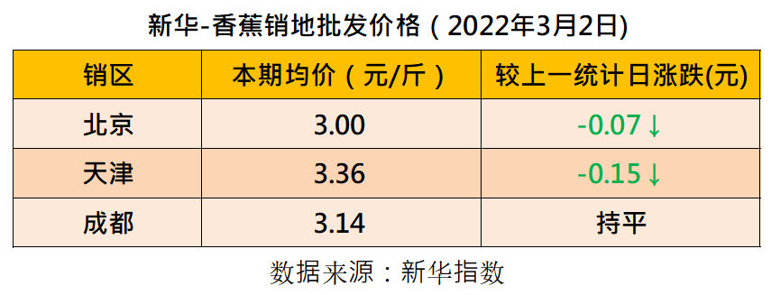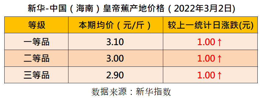 新华指数分析师指出,本监测期(2月24日-3月2日,下同)全国主要产区、销区气温均稳定回升,天气好转,产区询货客商增加,订货积极,但由于前期持续低温阴雨天气影响,当前产区肥蕉少,好货紧俏,产区行情普遍上涨;销区市场去库存,加快出货,行情小幅下跌;进口蕉方面,当前进口水果走货速度整体放缓,进口蕉行情延续下跌;皇帝蕉方面,随着天气转好,产区皇帝蕉品质向好,叠加市场走货加快,客商订购需求增加,蕉价上涨。