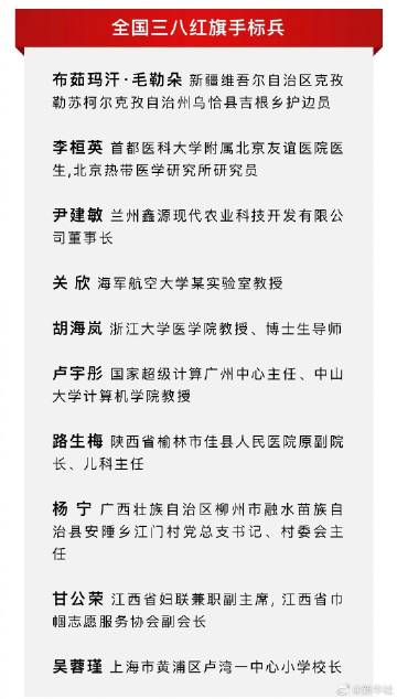 【#2021年度全国三八红旗手标兵公布#】记者3日从全国妇联获悉,全国妇联日前决定授予布茹玛汗·毛勒朵等10人全国三八红旗手标兵荣誉称号。名单见下图。