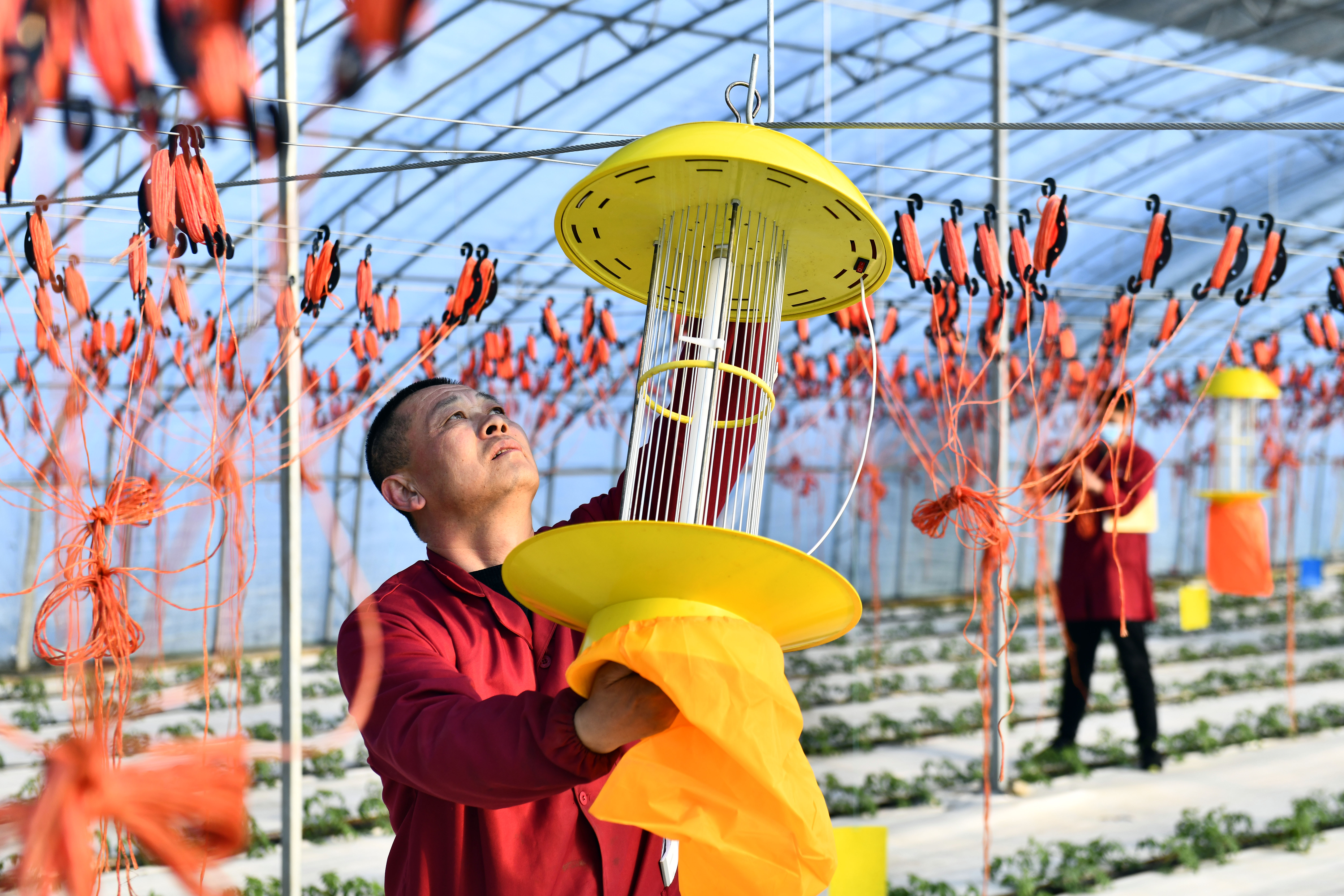 新华社照片,乳山(山东) ,2022年3月3日 山东乳山:村庄结对合作 助力乡村振兴 3月3日,在乳山市城郊特色农业产业示范区,工作人员在挂电子灭虫灯。 近年来,山东省乳山市引导特色村庄结对合作,优势互补,打造特色农业产业示范区,发展有机蔬菜和休闲观光农业,带动农民增收、农业增效,助力乡村振兴。 新华社记者 郭绪雷 摄