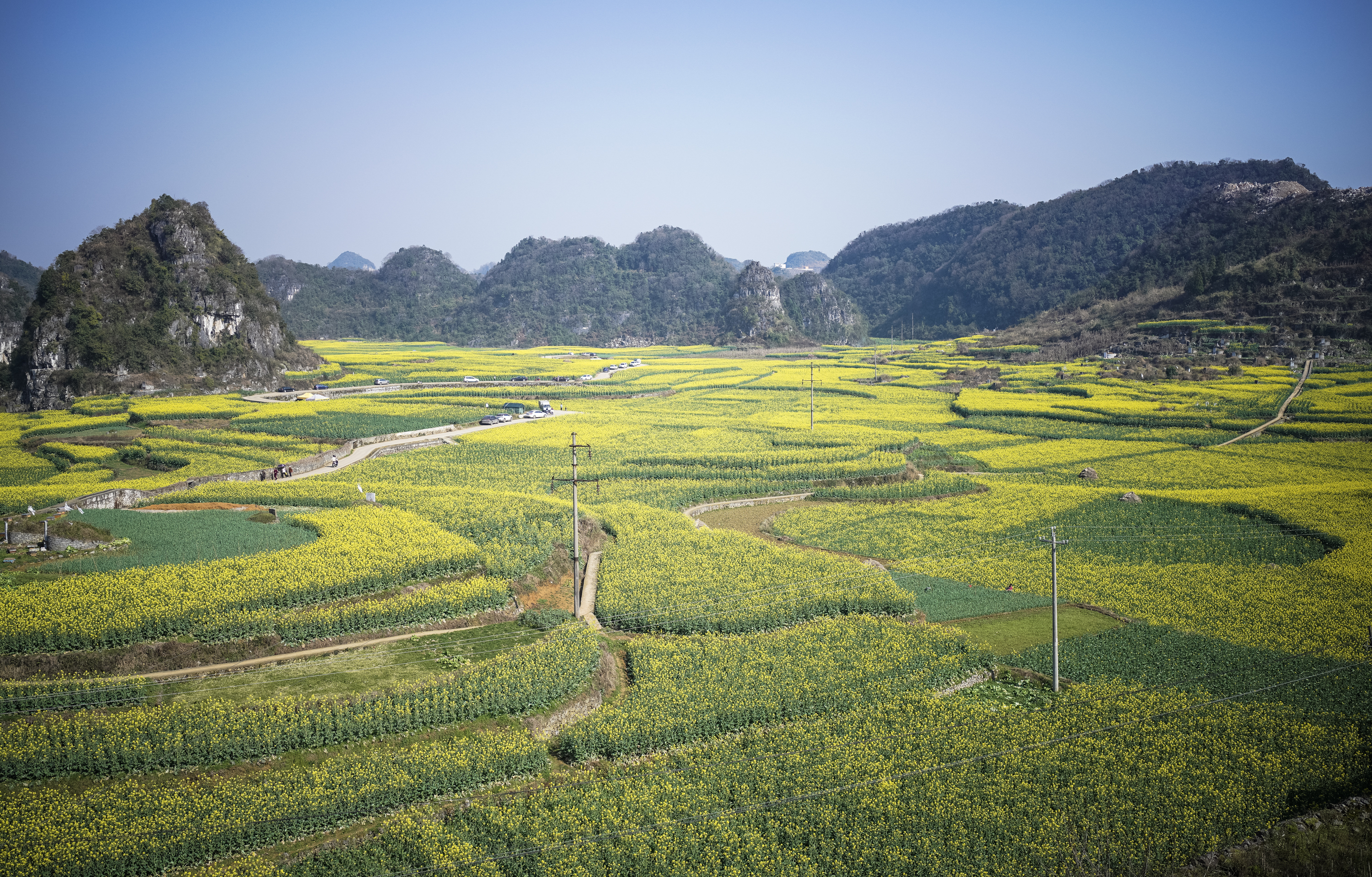 新华社照片,六枝(贵州),2022年3月3日 贵州六枝:油菜花开春意浓 贵州省六盘水市六枝特区木岗镇的油菜花田(3月3日摄)。 近日,贵州省六盘水市六枝特区木岗镇的万余亩油菜花竞相绽放,与田地、民居、道路构成了美丽的春日画卷。 新华社记者 陶亮 摄