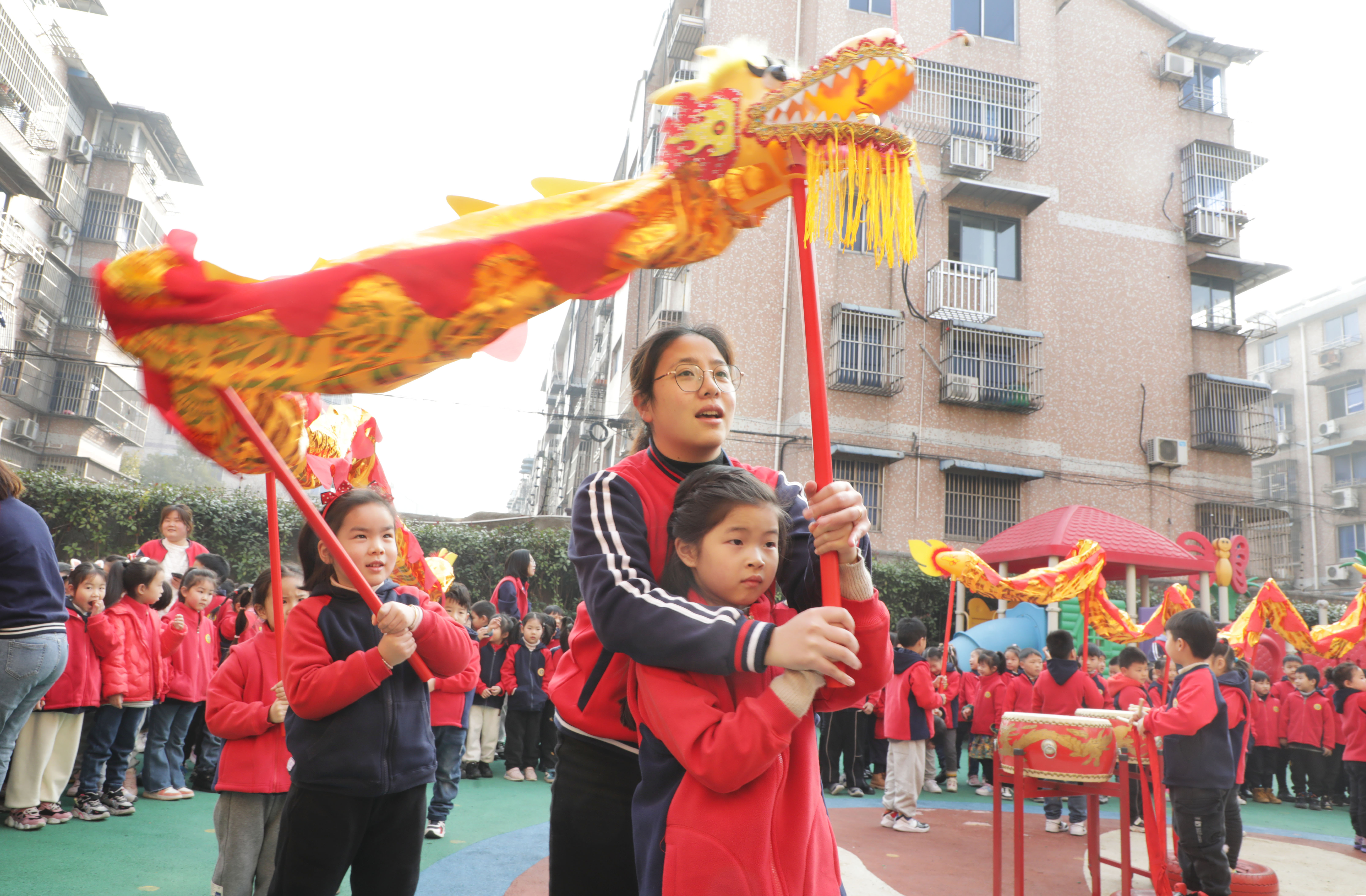 新华社照片,宜兴(江苏),2022年3月3日 多彩民俗喜迎“二月二” 3月3日,江苏省宜兴市丁蜀镇均陶幼儿园老师在教小朋友们舞龙。 农历二月初二到来之际,各地举办丰富多彩的民俗活动迎接“二月二”。 新华社发(丁焕新摄)