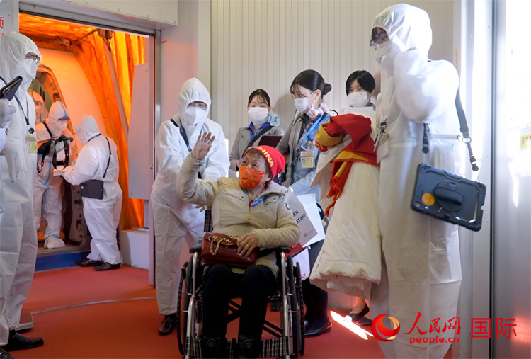 2月21日,冬奥冠军谷爱凌的姥姥在国航工作人员等的护送下通过廊桥。青城摄