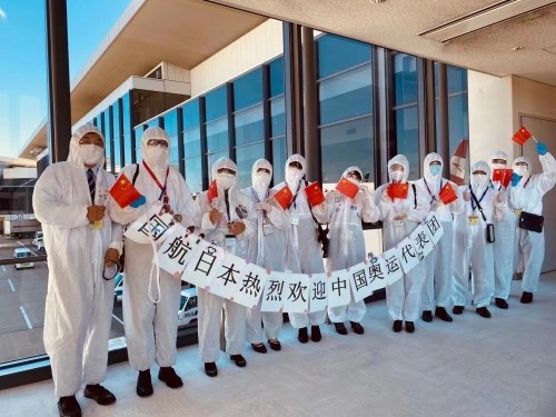 东京奥运会期间,国航日本地区总部工作人员热烈欢迎中国奥运代表团。国航日本地区总部供图