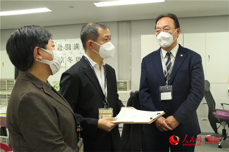 2月21日,国航日本地区总部总经理冯力(右)与北京冬奥航班保障团队人员探讨工作。李沐航摄