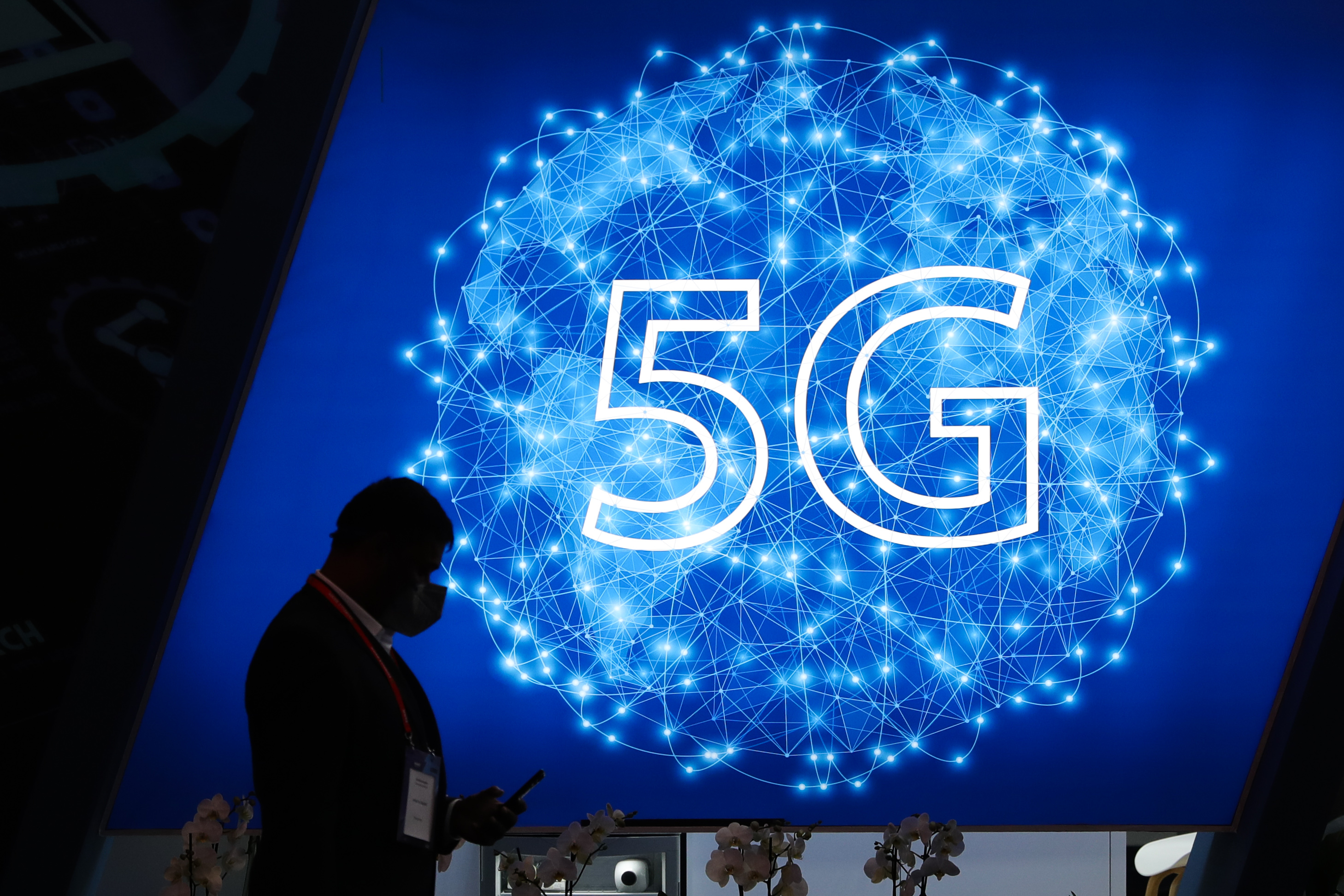 新华社照片,巴塞罗那,2022年3月3日 (国际)(5)2022世界移动通信大会在巴塞罗那闭幕 3月3日,在西班牙巴塞罗那2022世界移动通信大会上,一名男子经过一处5G标识。 2022世界移动通信大会于3月3日在西班牙巴塞罗那会展中心闭幕。 新华社记者 郑焕松 摄