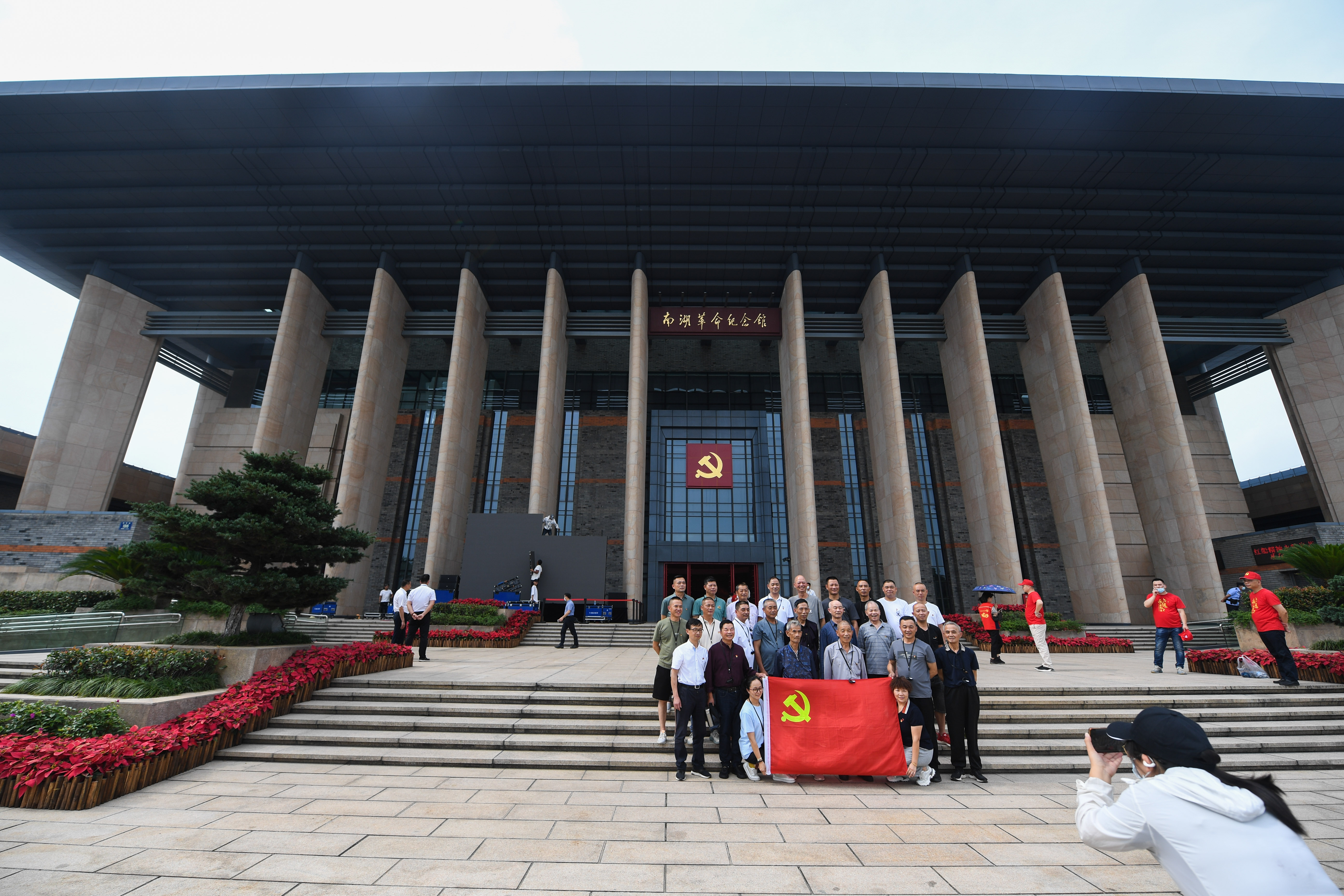 新华社照片,北京,2022年3月3日 万众一心向未来——写在2022年全国两会开幕之际 2021年6月30日,参观者在浙江嘉兴南湖革命纪念馆前合影。 (配本社同题文字稿) 新华社记者 徐昱 摄