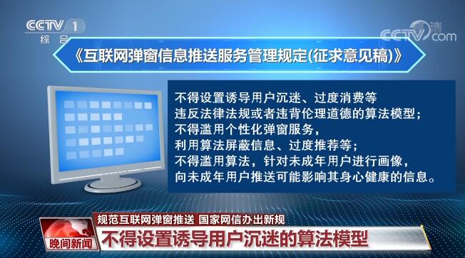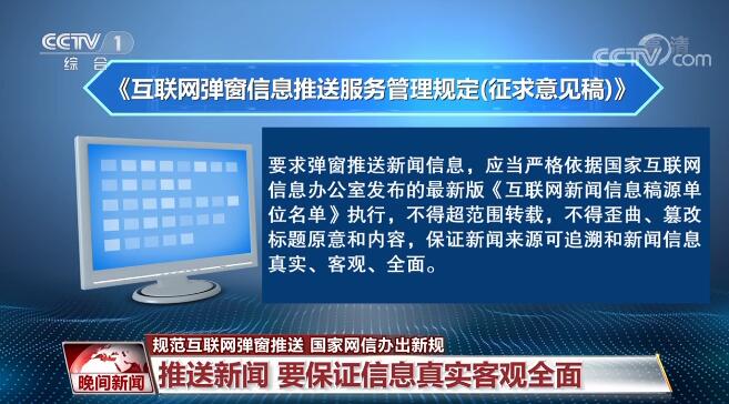 央视网消息:通过网页浏览器、手机、应用软件以及网站等渠道,以弹出消息窗口页面的形式向用户提供信息推送的服务,被称为“弹窗信息推送服务”,这类服务在给用户推送新闻信息的同时也夹杂了大量绯闻八卦、恶意翻炒的垃圾信息等内容。为了营造清朗网络空间,国家互联网信息办公室3月2日公布了《互联网弹窗信息推送服务管理规定(征求意见稿)》,对弹窗推送作出了具体规定。