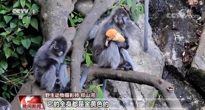 野生动物摄影师 郑山河:小金猴才出生的时候,它的全身都是金黄色的,三个月以后慢慢变色,开始从尾巴到四肢,毛变灰,(最后是)头顶,三个月以后金色就慢慢褪了,变成蓝灰色。