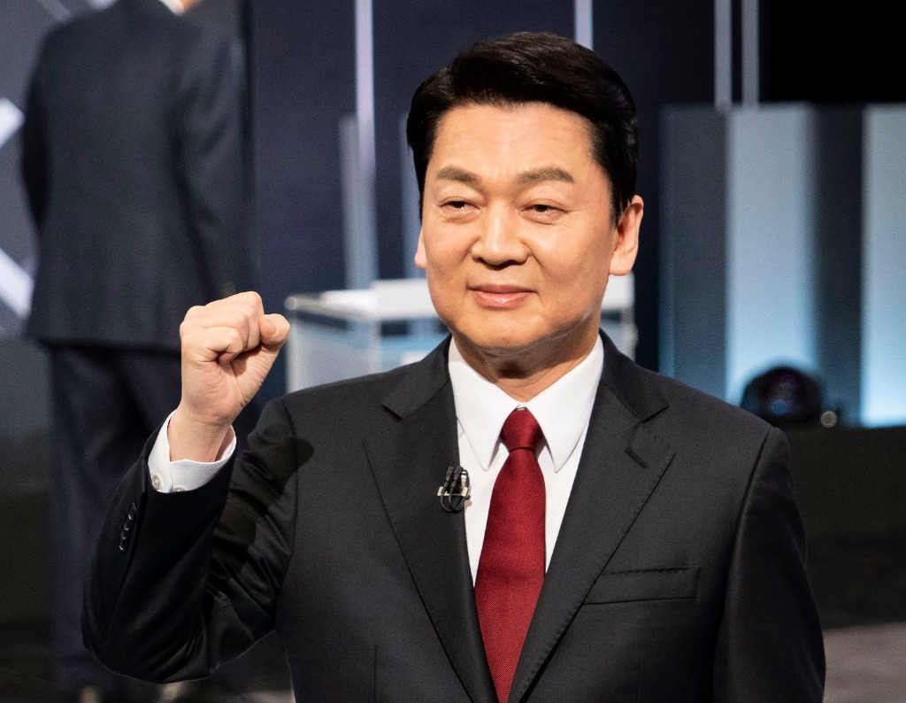 3月2日,在韩国首尔,国民之党候选人安哲秀参加电视辩论。(新华社发,李相浩摄)