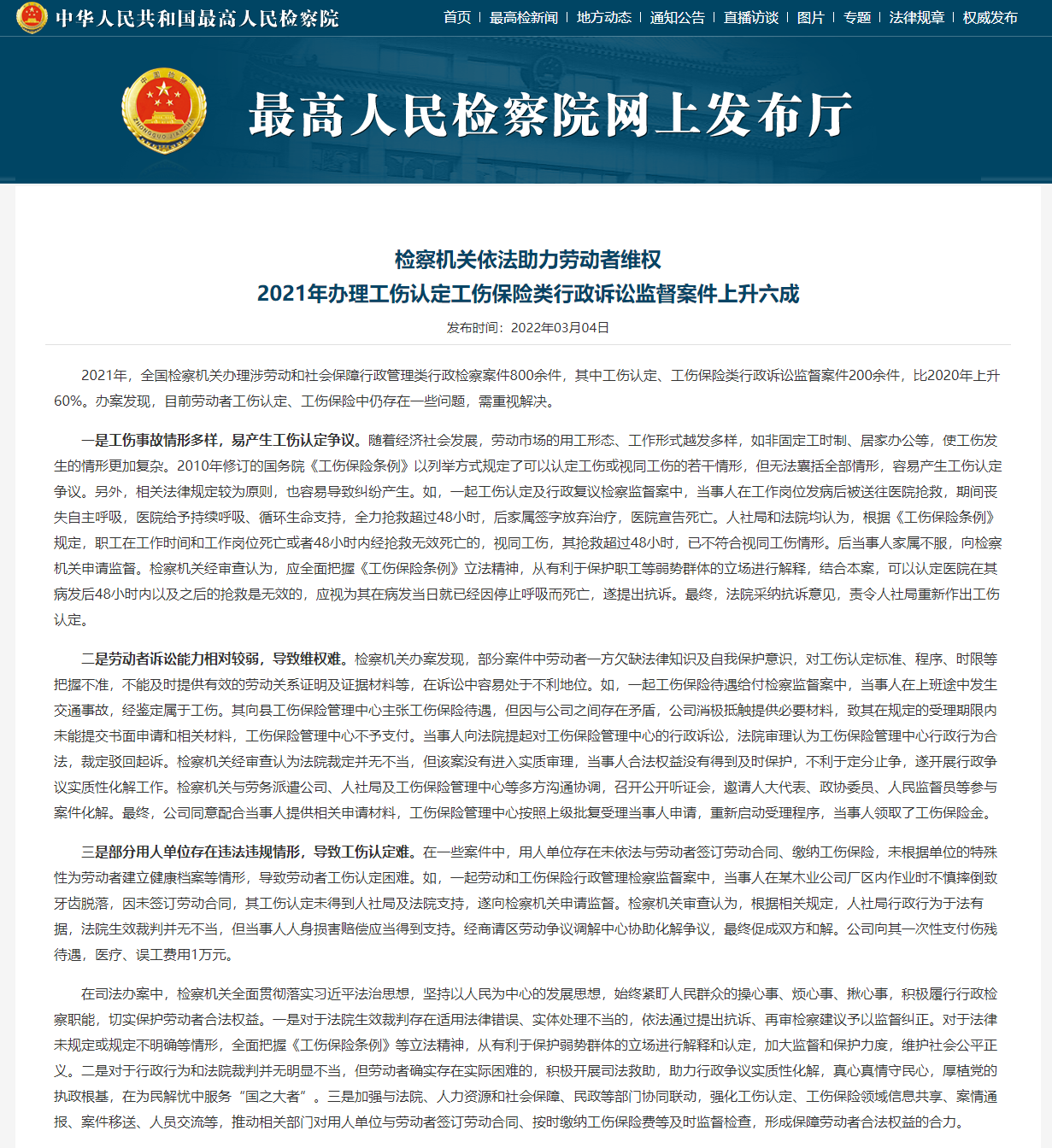 3月4日,最高人民检察院通报,2021年,全国检察机关办理涉劳动和社会保障行政管理类行政检察案件800余件,其中工伤认定、工伤保险类行政诉讼监督案件200余件,比2020年上升60%。