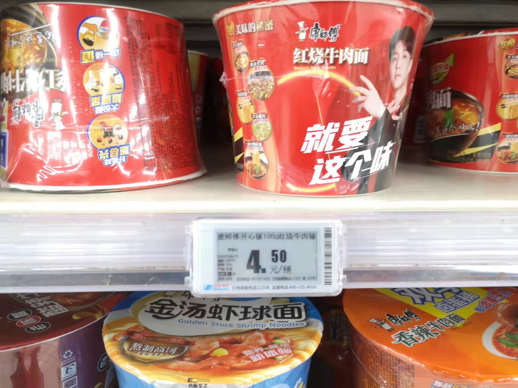 某超市的康师傅桶装红烧牛肉价格标注为4.5元/桶,涨价0.5元。孟刚/摄