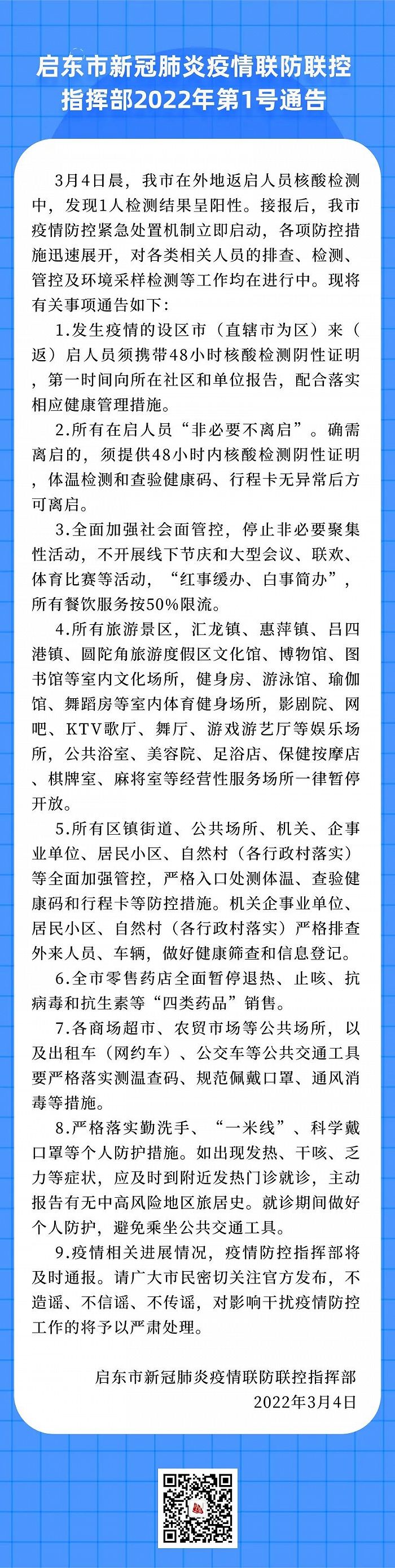 据“启东发布”微信公众号消息, 3月4日晨,启东市在外地返启人员核酸检测中,发现1人检测结果呈阳性。接报后,启东市疫情防控紧急处置机制立即启动,各项防控措施迅速展开,对各类相关人员的排查、检测、管控及环境采样检测等工作均在进行中。